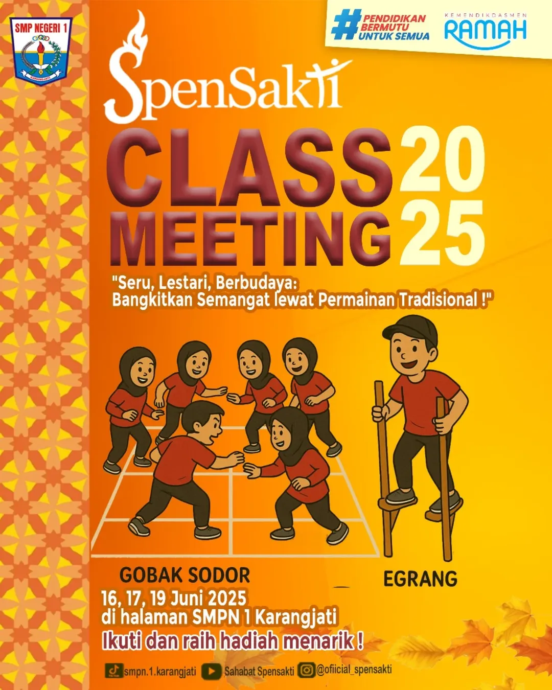 SMPN 1 Karangjati menggelar Class Meeting pada tanggal 16, 17, 19 Juni 2025 di halaman SMPN 1 Karangjati seperti Gobak Sodor dan Egrang